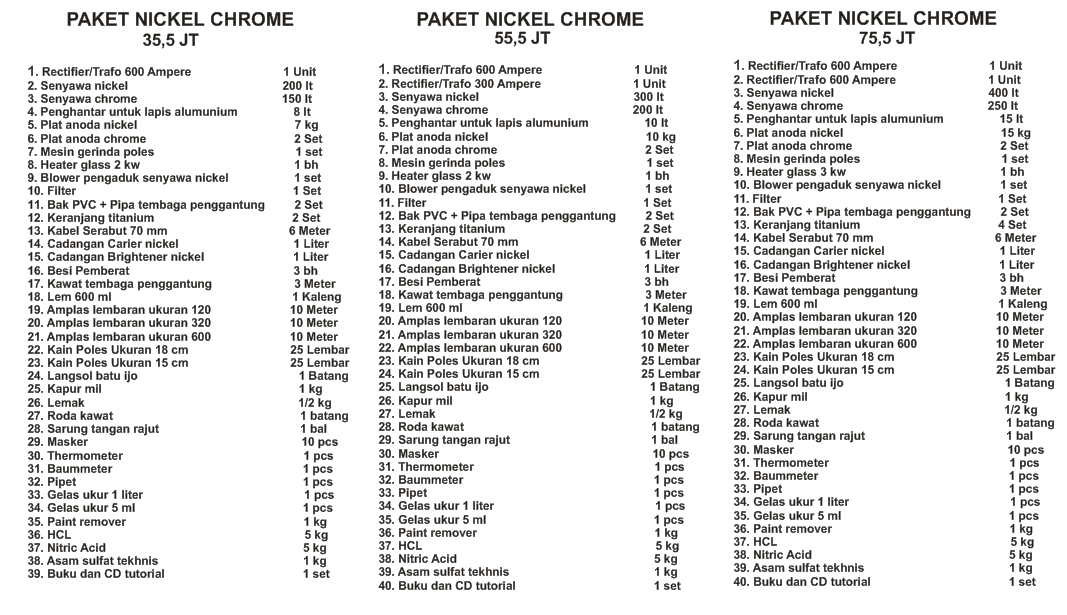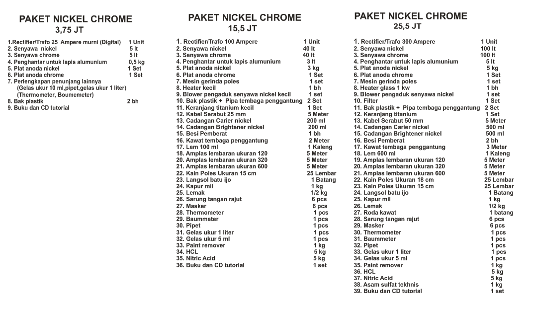 Berikut Daftar Paket paket alat dan bahan chrome logam lengkap :